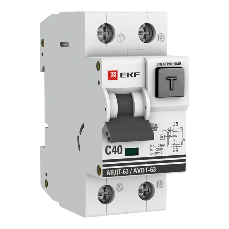Автоматические выключатели дифференциального тока малогабаритные АВДТ-63М представляют собой аппарат, сочетающий функции автоматического выключателя с электронным УЗО типа АС в компактном корпусе шириной 1 модуль. При обнаружении автоматическим выключателем на защищаемом участке сети тока утечки (повреждения) на землю или сверхтока (тока перегрузки или короткого замыкания) происходит срабатывание устройства, приводящее к отключению защищаемой сети. Особое отличие дифференциальных автоматов EKF с электронным УЗО в наличии блока защиты от перенапряжения.