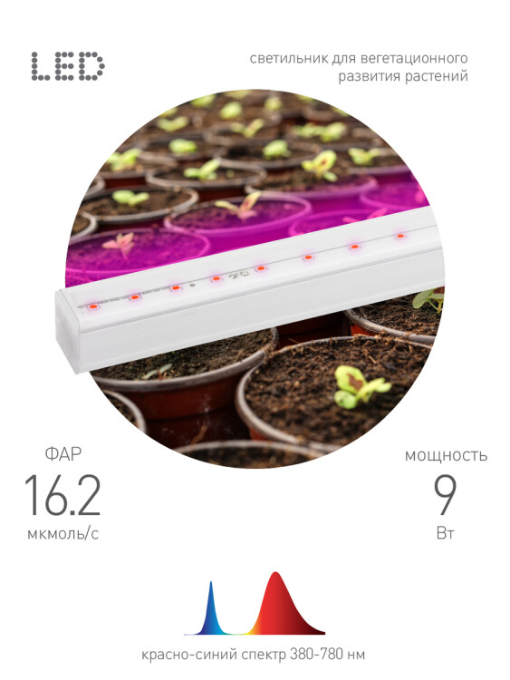<p>Светильник для растений ЭРА FITO-9W-Т5-N для выращивания зелени, рассады пасленовых, а также для досвечивания комнатных цветов. Спектр свечения светильника фиолетовый со сдвигом в розовую часть; соотношение синего к красному - 2 к 3. Сдвиг в область красного с добавлением свечения в области дальнего красного позволяет светильнику обеспечить питание корням и листьям и предотвратить вытягивание растений. Данная модель отличается прозрачным рассеивателем, крепким корпусом с хорошим теплоотводом. Диоды в светильнике работают в дефорсированном режиме, что обеспечит долгий срок службы и хорошую светоотдачу. Рекомендованное расстояние от светильника - не более 35 см до листьев растений. Минимальное расстояние - 5 см. Подвес светильника легко регулировать по высоте с помощью бечевки и комплекта скоб. Мощность светильника рассчитана на площадь подоконника соответствующей длины.</p>