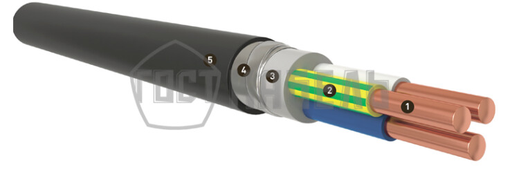 Кабель круглый с медными жилами, с изоляцией из ПВХ пластиката, с броней из стальных оцинкованных лент и защитным шлангом из ПВХ пластиката пониженной горючести, не распространяющий горение по категории А с низким дымо- и газовыделением.