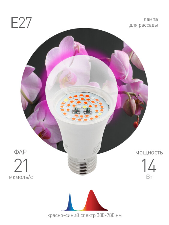 <p>Лампа ЭРА FITO-14W-RB-E27 красно - синего спектра для выращивания рассады, подсветки комнатных цветов станет Вашим не заменимым помощником. Данная лампа отлично подходит для зелени, пасленовых. Рекомендуемая высота расположения лампы над листьями от 5 до 25 см. Соотношение синего к красному как 1 к 3 дает возможность растениям марш бросок на набор питательных веществ и рост листьев. Так как масса выращиваемых растений прямо пропорциональна затраченной мощности, необходимо понимать что усиление эффекта от лампы возможно при увеличении светового потока. Для избежания ожога листьев мощность не должна превышать 450 Вт на м2. при высоте подвеса 4 местра. Прозрачный поликарбонатный рассеиватель сохраняет выходящую энергию, в отличие от ламп с молочным рассеивателем. </p><p>Обновленный рестайлинг лампы красно синего спектра лампа ЭРА FITO-14W-RB-E27 стала еще эффективнее. Светоотдача светодиодов увеличилась за счет снижения температуры кристалла. Долговечность микросхем драйвера так же увеличилась за счет снижения температуры на чипе. Поликарбонатный прозрачный рассеиватель позволит сохранить выдаваемый светодиодами световой поток на все 94 %. Отличная лампа для выращивания рассады, пасленовых, подсветки декоративных цветов будет Вас долго радовать. Расстояние от лампы до листьев должно быть в пределах от 10 до 25 см. В этом случае лампа будет работать максимально эффективно. Так как масса выращиваемых растений прямо пропорциональна затраченной мощности, необходимо понимать что усиление эффекта от лампы возможно при увеличении светового потока. Для избежания ожога листьев мощность не должна превышать 450 Вт на м2. Спектрограмма и суммарная мощность лампы не изменилась.</p>