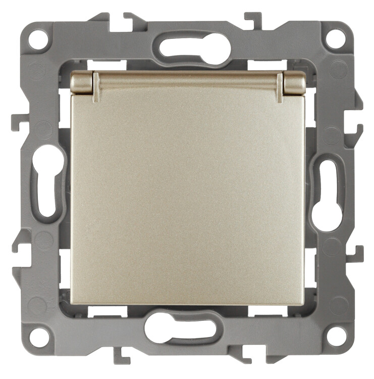 Розетка с заземлением со шторками с крышкой серии Эра 12 скрытой уст. механизм цвет шампань 12-2103-04. Номинальные хар-ки 16А 250В . Сделана из поликарбоната, оснащёна автоматическими клеммами для быстрй и надёжной фиксации жил кабеля в механиме. Парные клеммы обеспечивают соединение шлейфом. Монтаж в подрозетник производится и на лапки, и на винты. Рамки приобретаются отдельно.