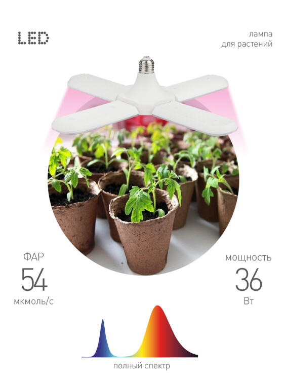 <p>Фитолампа-трансформер Е27 красно-синего спектра мощностью 36 Вт способна осветить несколько квадратных метров рассады с высокой эффективностью. Рекомендованная высота от лампы до листьев от 15 до 75 см. Регулировка поворота лепестков лампы на 180 градусов. Для получения сконцентрированного светового потока расположите лепестки под 90 градусов друг к другу. Прозрачный рассеиватель и белый глянцевый корпус лампы позволили сделать ее максимально энергоэффективной. Корпус из негорючего пластика. Лампа клевер ЭРА FITO-36W-RB-E27-FOLD на первый взгляд кажется странной и непривычной, но в лепестковой лампе за счет распределения печатных плат на большой площади проблема со съемом тепла с диодов решается намного легче и дешевле, чем в радиаторных лампах. В данном решении есть перфорация для съема тепла с блока питания лампы. Красно-синий спектр и эффективность лампы при этом не уступают стандартным решениям от компании ЭРА. Размеры: 98-393х250х100 мм.</p>