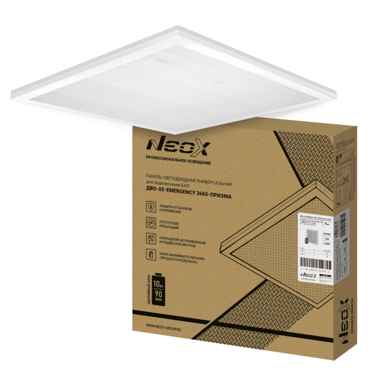 Светодиодная панель ДВО-02-EMERGENCY используется для основного и дополнительного освещения в офисах, торговых залах, административных зданиях, учебных заведениях и местах общественного питания. Данная модель является усовершенствованным решением для подвесных потолков стандарта «Армстронг» с возможностью подключения функции аварийного освещения. Возможность подключения блока аварийного пит ания гарантирует бесперебойную работу светильника при отключении электроэнергии - светильник будет функционировать еще 90 минут при светоотдаче не менее 30% от номинальной.