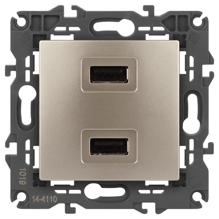 Устройство зарядное USB серии Эра Elegance цвет шампань 14-4110-04. Номинальные характеристики . Оснащёно автоматическими клеммами для надёжной фиксации жил кабеля в механизме. Рамки приобретаются отдельно. Рамки Эра Elegance ПЛАСТИК: 1 пост 14-5001-хх, 2 поста 14-5002-хх, 3 поста 14-5003-хх, 4 поста 14-5004-хх, 5 постов 14-5005-хх; СТЕКЛО: 1 пост 14-5101-хх, 2 поста 14-5102-хх, 3 поста 14-5103-хх, 4 поста 14-5104-хх; МЕТАЛЛ: 1 пост 14-5201-хх, 2 поста 14-5202-хх, 3 поста 14-5203-хх, 4 поста 14-5204-хх; ДЕРЕВО: 1 пост 14-5301-хх, 2 поста 14-5302-хх, 3 поста 14-5303-хх, 4 поста 14-5304-хх (хх - код цвета: 00-прозрачный, 01-белый, белёный дуб, 02-слоновая кость, 03-алюминий, 04-шампань, 05-чёрный, чёрное дерево, 07-ясень, 09-дуб, 10-венге, 11-клён, 14-медь, 21-жёлтый, 22-оранжевый, 23-красный, 25-бордо, 26-лайм, 27-зелёный, 28-голубой, 29-синий, 30-розовый, 31-мокко, 32-серый, 41-сталь, 42-титан).