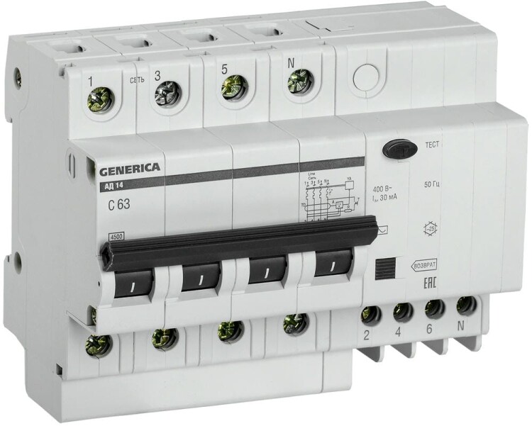 Диф.автомат АД14 4Р 63А 30мА GENERICA