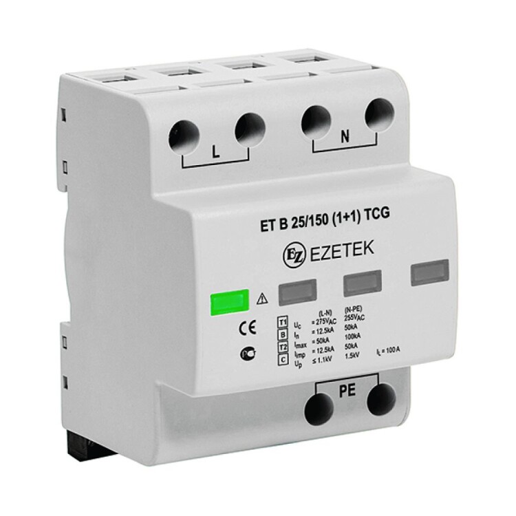 Арт. 500335. УЗИП ET B 25/150 (1+1) TCG. ET B 25/150 (1+1) TCG – однофазный ограничитель перенапряжений I+II класса для защиты электрического оборудования в низковольтных системах до 1000 В от прямых и отдалённых атмосферных разрядов при воздушном или кабельном вводе электропитания. Контролируемое и безопасное отключение от сети. Отсутствие искрения при отключении. Выдерживает нагрузки при протекании прямого тока молнии, соответствующие УЗИП класса I, а по ограничению наведённых и коммутационных перенапряжений – УЗИП класса II. Устанавливается во вводных щитах, в пределах ОА (В) – 1 зон молниезащиты в соответствии с ГОСТ Р МЭК 62305 и СО-153-34.21.122-2003. ГОСТ IEC 61643-11-2013Класс УЗИПI+IIМесто установкиГлавный распределительный щитТип низковольтной системы TT, TN-SМеста присоединенияN - PE, L - NИмпульсный токIimp = 12,5 кА / 50 кА (10/350 мкс)Разрядный токIn = 20 кА / 50 кА (8/20 мкс)Защитный элементВысокоэнергетический оксидно-цинковый варистор и разрядникБезопасностьВысокая устойчивость к ВПН, Без тока утечкиКорпусКомпактный 4 ТЕ