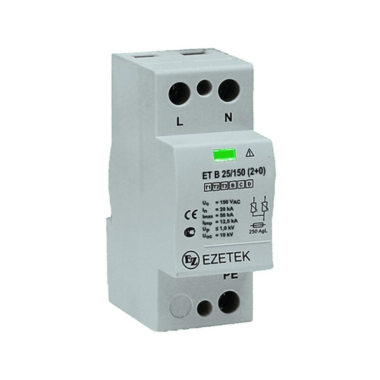 Арт. 504413. УЗИП ET B 25/150 (2+0). ET B 25/xxx (2+0) — однофазный ограничитель перенапряжений I+II класса для защиты электрического оборудования в низковольтных системах до 1000 В от прямых и отдалённых атмосферных разрядов при воздушном или кабельном вводе электропитания. Выдерживает нагрузки при протекании прямого тока молнии, соответствующие УЗИП класса I, а по ограничению наведённых и коммутационных перенапряжений – УЗИП класса II. Устанавливается во вводных щитах, в пределах ОА (В) – 1 зон молниезащиты в соответствии с ГОСТ Р МЭК 62305 и СО-153-34.21.122-2003.ГОСТ IEC 61643-11-2013Класс УЗИПI+IIМесто установкиГлавный распределительный щитТип низковольтной системы TN-SМеста присоединенияN - PE, L - PEИмпульсный токIimp = 12,5 kA (10/350 мкс)Разрядный токIn = 20 kA (8/20 мкс)Защитный элементВысокоэнергетический оксидно-цинковый варисторКорпусКомпактный 2 ТЕ Технические характеристики Род тока Переменный 50/60 Гц Номинальное рабочее напряжение Uo 120 В Максимальное длительное рабочее напряжение Uc 150 В Номинальный разрядный ток (8/20 мкс) In 20 кА Максимальный разрядный ток (8/20 мкс) Imax 50 кА Импульсный ток (10/350 мкс) Iimp 12,5 кА Суммарный импульсный ток (10/350 мкс) Itotal 25 кА Удельная энергия W/R 39 кДж / Ом Заряд Q 6,25 Ас Уровень напряжения защиты Up < 1,0 кВ Время срабатывания tA < 25 нс Номинал защитного предохранителя (если на вводе > 250 A) 250 A gG Номинальный ток короткого замыкания ISCCR 50 кА Значение временного испытательного перенапряжения ВПН, выдерживает 5 сек. UT 174 В Значение временного испытательного перенапряжения ВПН, безопасное отключение 120 мин. UT 229 В Количество полюсов 2 Механические характеристики Рабочая температура Т а От -40 ?C до +85 ?C Допустимая влажность RH 5%...95% Крутящий момент затяжки Mmax 3,0 Нм Максимальное сечение подключаемых проводов 35 мм 2 (одножильный) / 25 мм 2 (многожильный) Монтаж 35 мм DIN рейка Степень защиты оболочки, ГОСТ 14254-2015 IP 20 Материал корпуса Термопластик: Степень тушения UL 94 V-0 Тепловая защита Есть Индикатор аварийного состояния Красный Дистанционная сигнализация Есть Коммутационная способность AC: 250 В / 0,5 А; 125 В / 3 А Максимальное сечение подключаемых проводов 1,5 мм 2 (одножильный) Крутящий момент затяжки Mmax 0,25 Нм Артикул ET B 25/150 (2+0) 504413