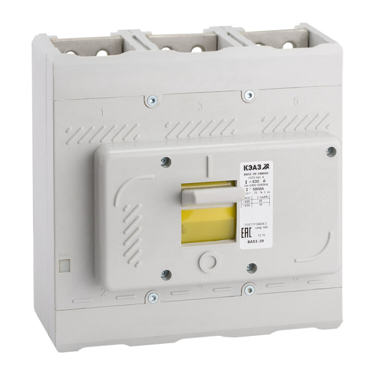 Силовой 3 полюсный автоматический выключатель переменного тока в литом корпусе на номинальный ток 400 А. Трехполюсные автоматические выключатели КЭАЗ типа ВА 51-39 предназначены для применения в электрических цепях с напряжением 400 / 690 В переменного тока частотой 50 и 60 Гц и 440В постоянного тока, их защиты от токов короткого замыкания, токов перегрузки, недопустимых снижений напряжения, а также для нечастых оперативных включений и отключений.