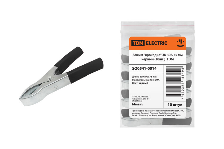 Зажим "крокодил" 30А 75мм черный (10шт) TDM предназначен для фиксации или временного соединения проводников