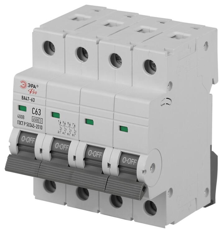 <p>Автоматический выключатель - контактный коммутационный аппарат, способный включать токи, проводить их и отключать при нормальных условиях в цепи, а также включать, проводить в течение нормированного (заданного) времени и автоматически отключать токи при нормированных ненормальных условиях в цепи, таких, как токи короткого замыкания. Автоматические выключатели бывают одно-, двух-, трёх- или четырёхполюсными и имеют следующие конструктивные узлы: главную контактную систему, дугогасительную систему, привод расцепляющего устройства, расцепители. Автоматические выключатели ВА47-63 предназначены для защиты распределительных и групповых цепей, имеющих различную нагрузку: электроприборы, освещение выключатели с характеристикой В; двигатели с небольшими пусковыми токами (компрессор, вентилятор) выключатели с характеристикой C; двигатели с большими пусковыми токами (подъемные механизмы, насосы) выключатели с характеристикой D.</p>