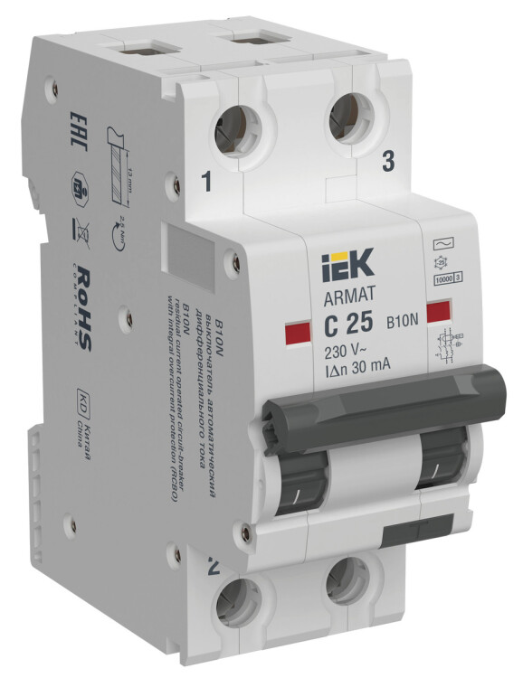 Автоматические выключатели дифференциального тока (АВДТ) ARMAT серии B10N - надежное решение для промышленности, энергетики и бытового применения. B10N функционально не зависят от напряжения сети, что обеспечивает функциональную работу даже в случае исчезновения нуля. Номинальная наибольшая отключающая способность 10 кА гарантирует надежную работу устройства даже при высоких токах короткого замыкания. Топология полюсов B10N 2P означает, что функции защиты от токов перегрузки и короткого замыкания, а также дугогасительная ферромагнитная решетка реализованы в каждом полюсе. Независимый механизм свободного расцепления с мгновенной коммутацией обеспечивает безопасное включение, а защитная шторка исключает неправильное подключение и ошибку при монтаже. Подключение шинами PIN и FORK реализовано сверху и снизу устройства. B10N позволяет присоединять любые дополнительные модульный устройства ARMAT серии AUX. Модельный ряд включает в себя устройства с номинальными токами от 8 до 32 А, характеристиками срабатывания по сверхтоку B и C, типами защит AC и A с номинальными дифференциальными токами отключения 30, 100, 300 мА.