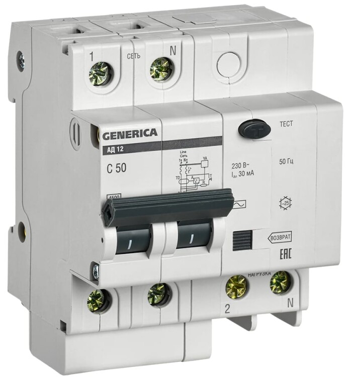 Диф.автомат АД12 2Р 50А 30мА GENERICA
