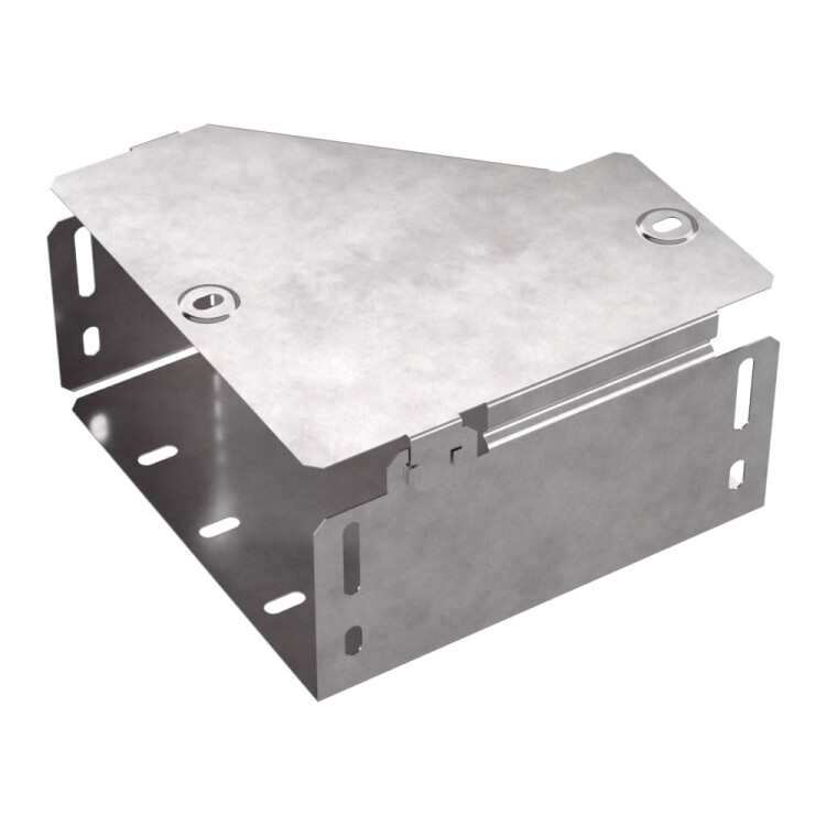Аксессуары изготовленные из стали с защитным покрытием по методу Сендзимира – это изделия, на которых защитное цинковое покрытие было нанесено на листовую сталь перед изготовлением. Толщина защитного покрытия варьируется от 10 до 22мкм. Климатическое исполнение изделий УХЛ2, что предусматривают эксплуатацию в помещении и под навесом, при температуре эксплуатации от -80 до +150°С. Переходник правы й предназначен для перехода с одной ширины лотка на другую. В комплект входит крышка.