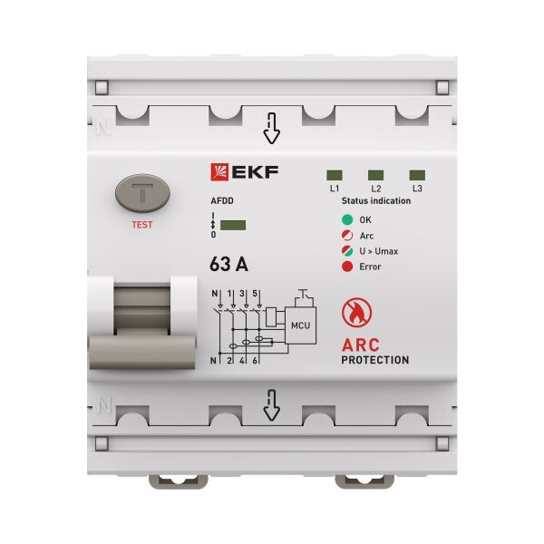 УЗДП 3P+N PROXIMA от EKF — интеллектуальная защита трёхфазных цепей 380-415 В от пожаров, вызванных дуговым пробоем. Устройство мгновенно распознаёт опасную дугу по форме тока и высокочастотным сигналам и отключает линию за доли секунды. Также реагирует на перенапряжение. Подключение — питание сверху к клеммам N, 1, 3, 5. Момент затяжки винтов — до 3 Н·м. На лицевой панели — светодиодные индикаторы, обозначающие причину срабатывания. Совместим с гребёнчатыми и U?образными шинами, соответствует ГОСТ IEC 62606, работает при –25…+40?°C, имеет класс защиты IP20, срок службы — 20 лет, гарантия — 7 лет.