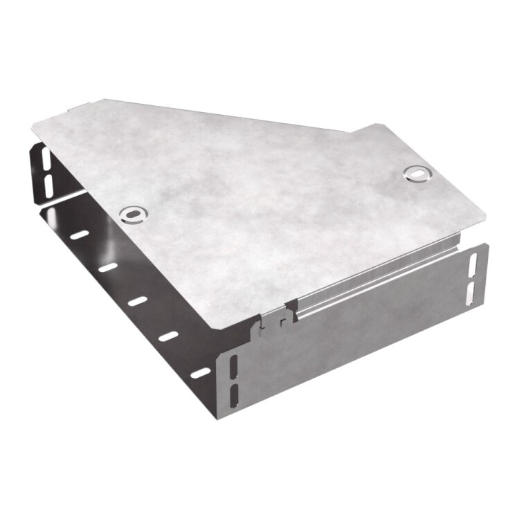 Аксессуары изготовленные из стали с защитным покрытием по методу Сендзимира – это изделия, на которых защитное цинковое покрытие было нанесено на листовую сталь перед изготовлением. Толщина защитного покрытия варьируется от 10 до 22мкм. Климатическое исполнение изделий УХЛ2, что предусматривают эксплуатацию в помещении и под навесом, при температуре эксплуатации от -80 до +150°С. Переходник правы й предназначен для перехода с одной ширины лотка на другую. В комплект входит крышка.
