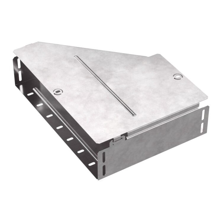Аксессуары изготовленные из стали с защитным покрытием по методу Сендзимира – это изделия, на которых защитное цинковое покрытие было нанесено на листовую сталь перед изготовлением. Толщина защитного покрытия варьируется от 10 до 22мкм. Климатическое исполнение изделий УХЛ2, что предусматривают эксплуатацию в помещении и под навесом, при температуре эксплуатации от -80 до +150°С. Переходник правы й предназначен для перехода с одной ширины лотка на другую. В комплект входит крышка.