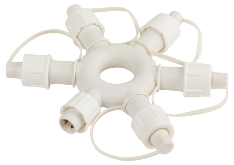 <p>Разветвитель для гирлянд ЭРА подойдет для любого праздника. С помощью него можно создать настоящие произведения искуства из гирлянд. Разветвитель выполнен в виде кольца - снежинки и имеет 6 выходов. Он подойдет для внутреннего декорирования дома или наружной иллюминации под навесом. Степень защиты - IP44. Такая степень защиты предполагает использование прибора во влажных помещениях, где на него может воздействовать пар. Диаметр кольца составляет 13 см. Корпус разветвителя выполнен из материала ПВХ. В качестве дополнительной защиты каждый из коннекторов дополнен заглушкой, которую можно применить, если выход не используется. Купив разветвитель для гирлянд ЭРА, вы останетесь довольны и сможете создать праздничную атмосферу в доме!</p>