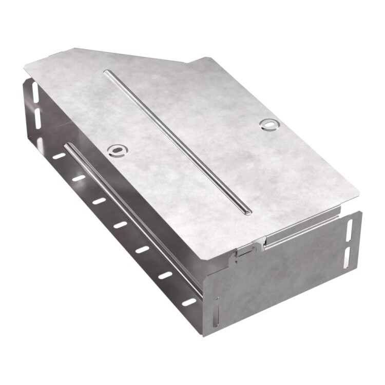 Аксессуары изготовленные из стали с защитным покрытием по методу Сендзимира – это изделия, на которых защитное цинковое покрытие было нанесено на листовую сталь перед изготовлением. Толщина защитного покрытия варьируется от 10 до 22мкм. Климатическое исполнение изделий УХЛ2, что предусматривают эксплуатацию в помещении и под навесом, при температуре эксплуатации от -80 до +150°С. Переходник правы й предназначен для перехода с одной ширины лотка на другую. В комплект входит крышка.