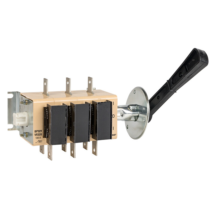 Выключатели-разъединители ВР32У (универсальные) серии MAXima предназначены для ручного включения-отключения цепей переменного тока с номинальным напряжением до 690 В частотой 50 Гц. В конструкции применена трехполюсная контактная система ножевого типа с двойным видимым разрывом цепи. С помощью двойного разрыва цепи, больших растворов контактов и дугогасительных камер обеспечивается эффективное гашение электрической дуги при коммутации нагрузок, что препятствует преждевременному и чрезмерному износу контактов. Конструкция контактных выводов обеспечивает болтовое присоединение шин или проводников, оконцованных кабельными наконечниками. Все рубильники являются универсальными по типу присоединения рукоятки. Конструкция рубильника предусматривает установку рукоятки как справа от корпуса, так и слева. Расположение рукоятки, левое или правое, можно поменять в процессе эксплуатации при необходимости. Расположение плоскости присоединения внешних зажимов контактных выводов перпендикулярно плоскости монтажа. Выпускается несколько исполнений ВР32У: • на одно и на два направления; • с несъемной рукояткой; • со съемной смещенной рукояткой.