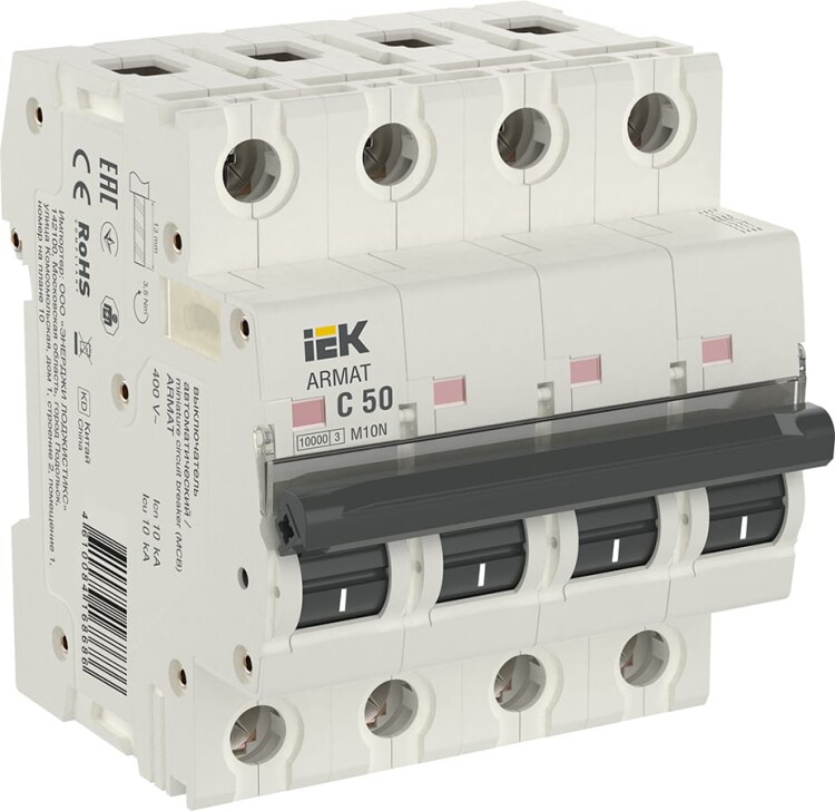 Автоматические выключатели ARMAT серии M10N предназначены для защиты цепей от перегрузки и короткого замыкания. Модельный ряд включает в себя устройства с характеристиками срабатывания B, C, D и номинальными токами от 0,5 до 63 А. Номинальная отключающая способность автоматических выключателей ARMAT серии M10N составляет 10 кА. Предельная отключающая способность варьируется в зависимости от номинала от 10 до 50 кА.