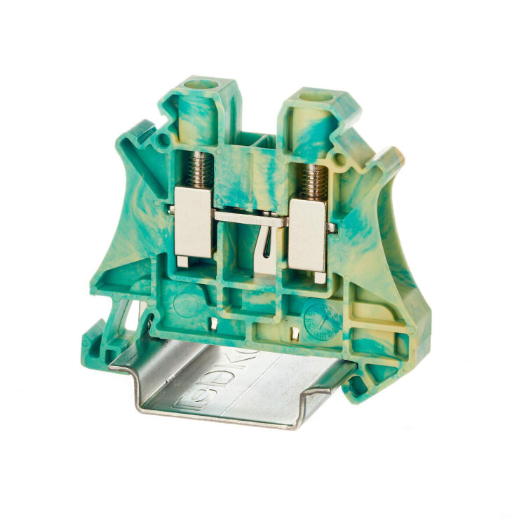 Клемма для заземления с винтовым зажимом предназначена для соединения двух проводников. Монтаж на DIN-рейку OMEGA. Температура эксплуатации от -40 до +105C. Корпус выполнен из ПА 6.6 с классом горючести V0 UL-94. Имеет электрический контакт с DIN-рейкой. Желто-зеленый цвет, 2 точки подключения, 6 мм2. Габариты (ВxШxГ) 47,5x53x8,2 мм.
