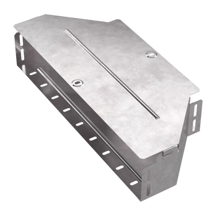 Аксессуары изготовленные из стали с защитным покрытием по методу Сендзимира – это изделия, на которых защитное цинковое покрытие было нанесено на листовую сталь перед изготовлением. Толщина защитного покрытия варьируется от 10 до 22мкм. Климатическое исполнение изделий УХЛ2, что предусматривают эксплуатацию в помещении и под навесом, при температуре эксплуатации от -80 до +150°С. Переходник симме тричный предназначен для перехода с одной ширины лотка на другую. В комплект входит крышка.
