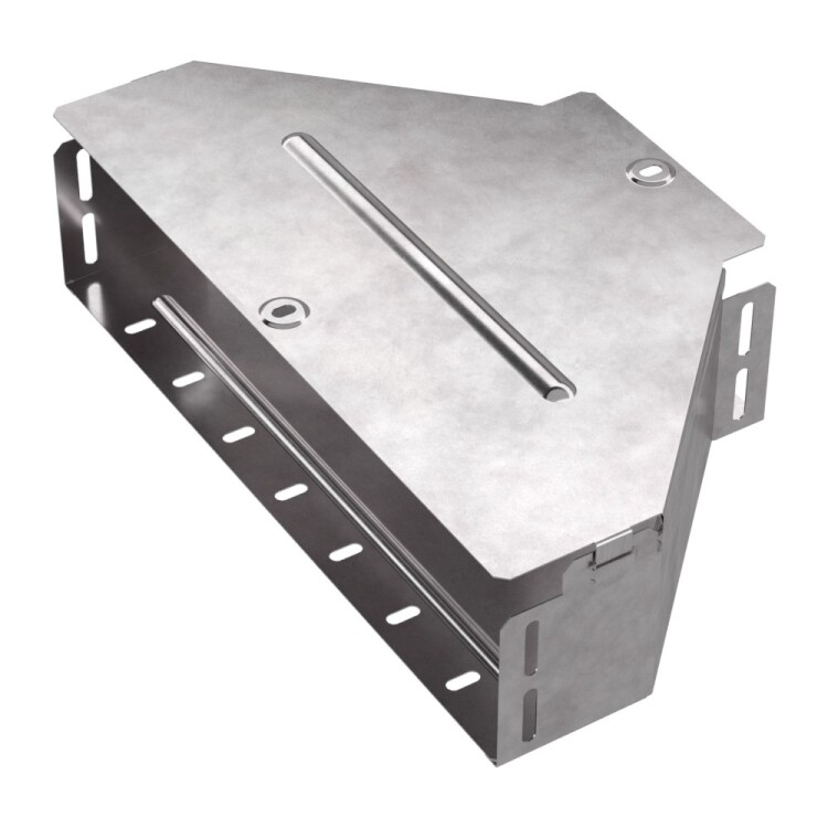 Аксессуары изготовленные из стали с защитным покрытием по методу Сендзимира – это изделия, на которых защитное цинковое покрытие было нанесено на листовую сталь перед изготовлением. Толщина защитного покрытия варьируется от 10 до 22мкм. Климатическое исполнение изделий УХЛ2, что предусматривают эксплуатацию в помещении и под навесом, при температуре эксплуатации от -80 до +150°С. Переходник симме тричный предназначен для перехода с одной ширины лотка на другую. В комплект входит крышка.