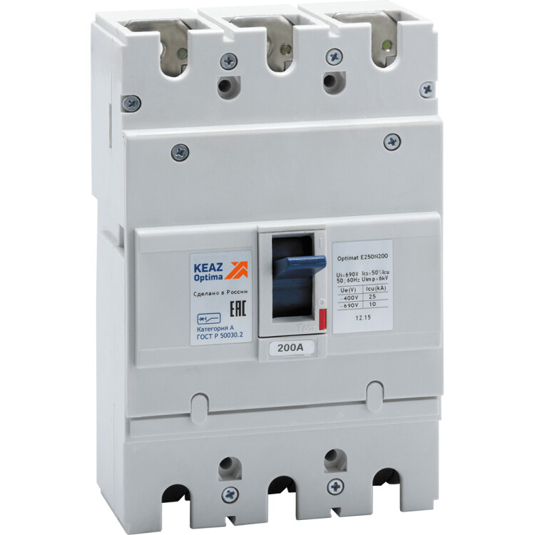 Силовой 3 полюсный автоматический выключатель переменного тока в литом корпусе на номинальный ток 200 А. Новая разработка КЭАЗ - серия автоматических выключателей OptiMat E - обеспечивает необходимую защиту кабелей и оборудования на токи до 250А и полностью отвечают современным стандартам (ГОСТ Р 50030.2 и МЭК60947-2), требованиям Российского морского регистра судоходства.Предельная коммутационная способность (ПКС) автоматических выключателей от 10 кА при 400В переменного тока частотой 50/60 Гц является самым нужным значением для большинства объектов.