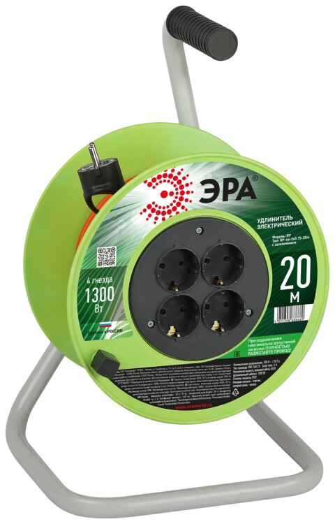 <p>Удлинитель силовой на пластиковой катушке ЭРА RP-4e-3х0.75-20m с заземлением, 4 розетки, провод ПВС 3х0,75м2, 20 м. Мощность 6А/1300Вт. Используется для работы на строительных площадках или дачных участках. Удобен при работе с приборами, находящимися удаленно от стационарной розетки. Например, газонокосилки, электрические, пилы, триммеры или электродрели. Провод в удлинителях Эра сделан из 100% меди, что де лает его абсолютно пожаробезопасным. Рама удлинителя сделана из высокопрочной стали, а пластиковой корпус выполнен с применением негорючих добавок.</p>